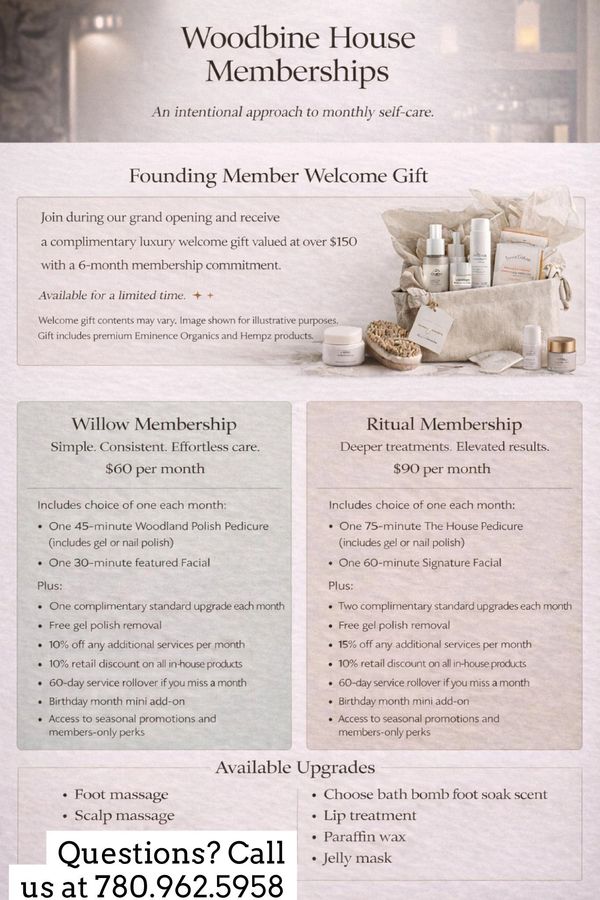 NEW to us! We are excited to offer 2 types of monthly memberships, to help you experience the spa regularly without breaking the bank. Each membership gets auto charged to the card on file, you get to pick if you want a pedicure or facial (can swap each month), plus you get great upgrades for free each month.